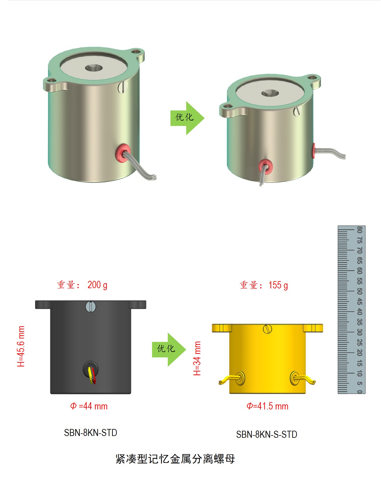 紧凑型记忆金属分离螺母(SBN-S系列)是SBN常规系列分离螺母的轻小型优化改进型号,其工作原理和SBN常规系列相同,采用优化记忆金属丝训练工艺、加严记忆金属驱动器装配及筛选工艺、结构优化设计等技术手段,在保证分离螺母主要性能指标前提下有效缩减了产品包络尺寸(高度降低了约25%),降低了产品重量(重量减轻了约23%),非常适合狭小空间下有效载荷的锁紧释放,例如太阳翼压紧释放、小型激光终端锁紧释放等。